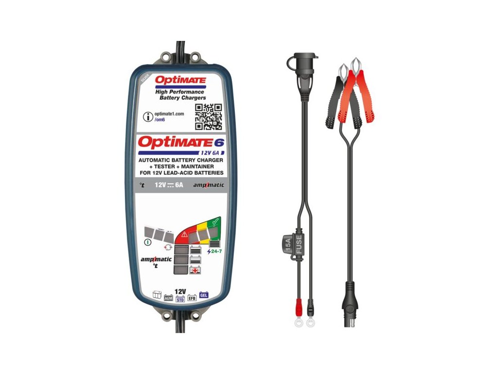 Táto profesionálna nabíjačka nie je určená len pre servisy, ale aj pre bežného používateľa, ktorý si potrpí na prvotriednu kvalitu a pohodlie. Optimate 6 dokáže nielen batériu nabiť, ale aj oživiť hlboko vybité akumulátory, otestovať stav batérie a udržiavať ju trvalo v nabitom stave. Optimate 6 môže byť trvalo pripojený k akumulátoru.